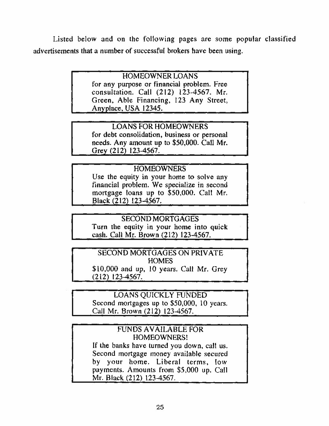 The IWS Guide to How to be a Second Mortgage Loan Broker by R. Briskey gives the reader step-by-step methods for developing his/her business as a second mortgage broker. This comprehensive, yet easy-to-read-and-put-into-action, manual covers