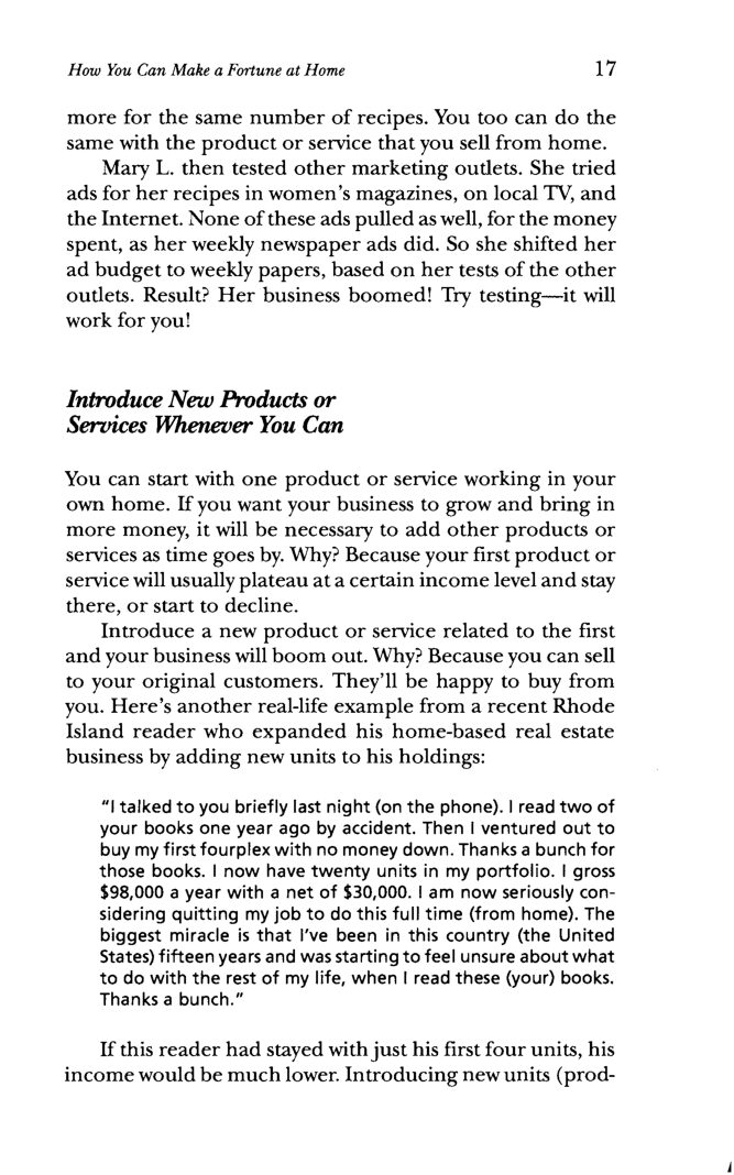 Over the years I’ve shown thousands of Beginning Wealth Builders—BWBs in my shorthand notation—how to start and succeed in their own home-based business. And these happy BWBs—many of whom are stay-at-home moms (or dads)— voluntarily write me thousands of glowing letters telling me that the ideas I gave them really do work! Now I’m ready to show you how you can do the same—starting this very in- stant on your own kitchen table or in your garage or basement. You can even start your own business in a trailer, motor home, boat, or mountain cabin!