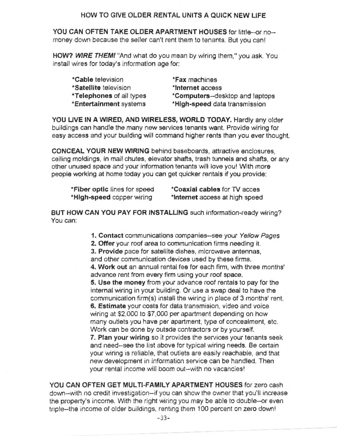 Your IWS Money-Making Manual has 60 ways to build your fully financed real estate fortune. Each way occupies one page in your Manual. We suggest that you read one GUIDE page per day. By the end of 60 days-or possibly sooner-you will find a financing method that will probably work for you. While we cannot, and do not, guarantee that you will get your real estate fully financed, there is a good chance that you will find a way to finance the income real estate you want to buy.