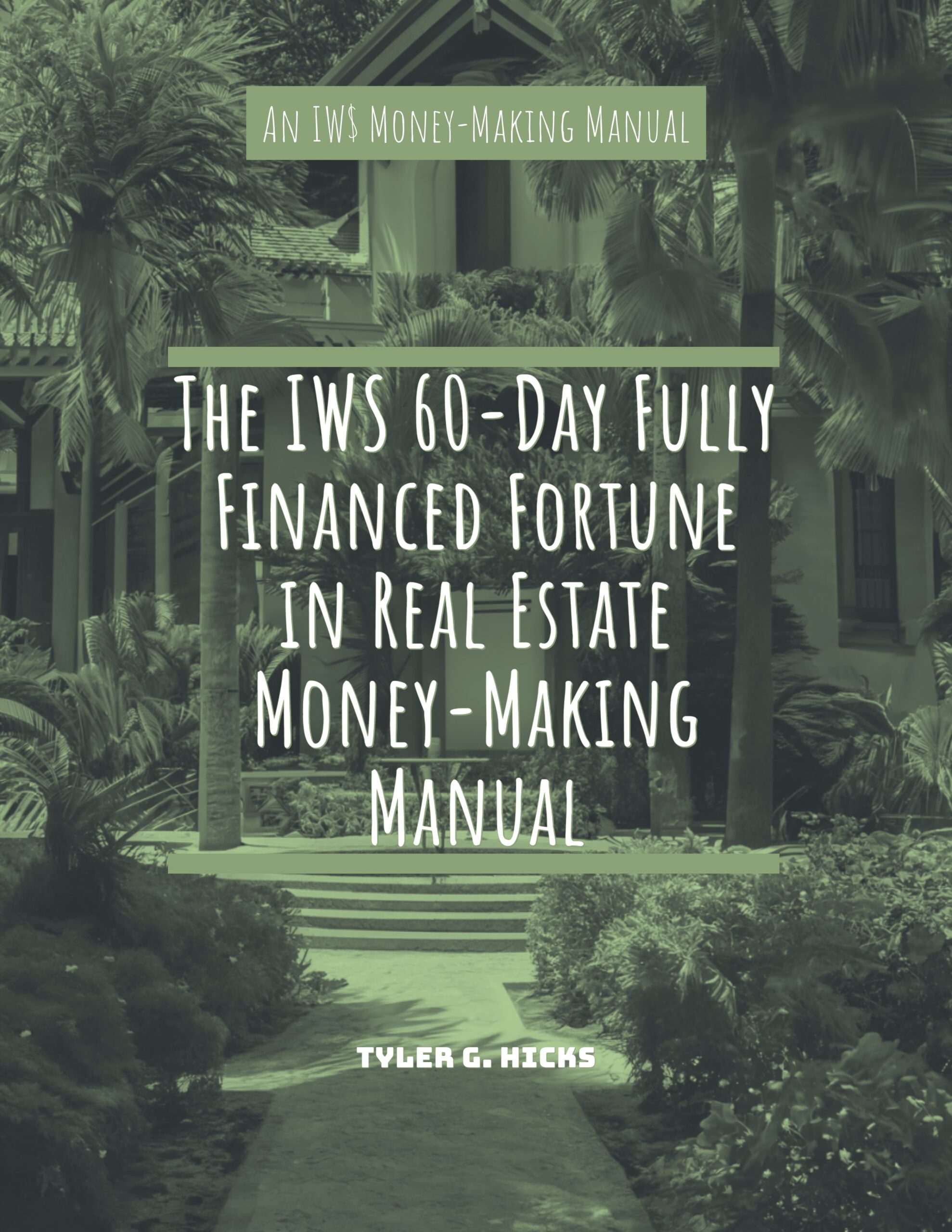 The IWS 60-Day Fully Financed Fortune in Real Estate Money-Making Manual is a compact business manual by Tyler G. Hicks that will illuminate the as-the-crow-flies path to building your real estate fortune with little — if any! — money down. This comprehensive and intense guidebook begins at Day 1 and goes to the cover topics such as