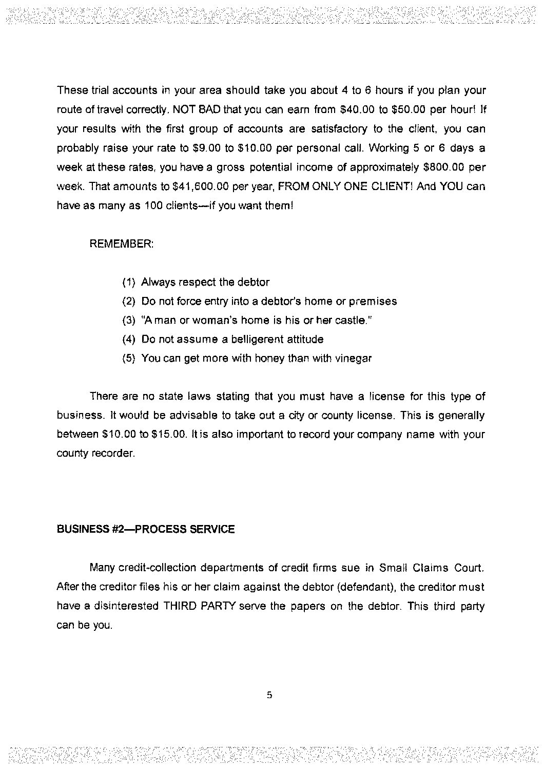 The following is a list of businesses that you can start for a very small investment. They are all a very necessary part of credit-collection. They are NEEDED EVERY DAY by individually owned credit firms, companies, or large corporation.
